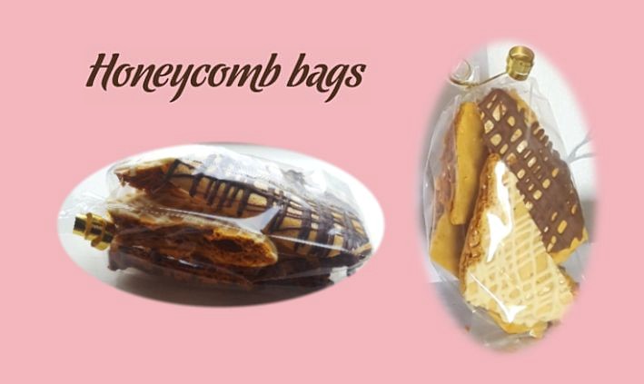 Generously sized bags of crisp honeycomb, cinder toffee drizzled in white, milk and dark chocolate.