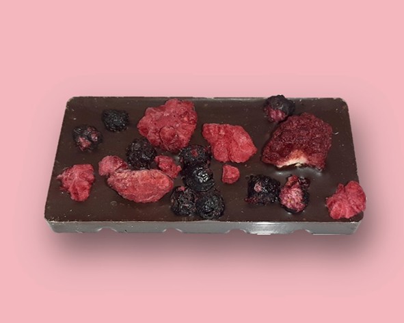 Delicious dark chocolate bar flavoured with blackberry & topped with an assortment of freezed dried fruit