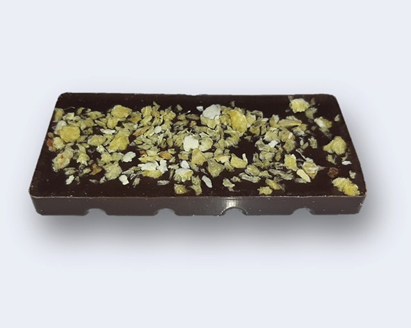 Delicious dark chocolate bar infused with orange extract topped with flakes of real orange